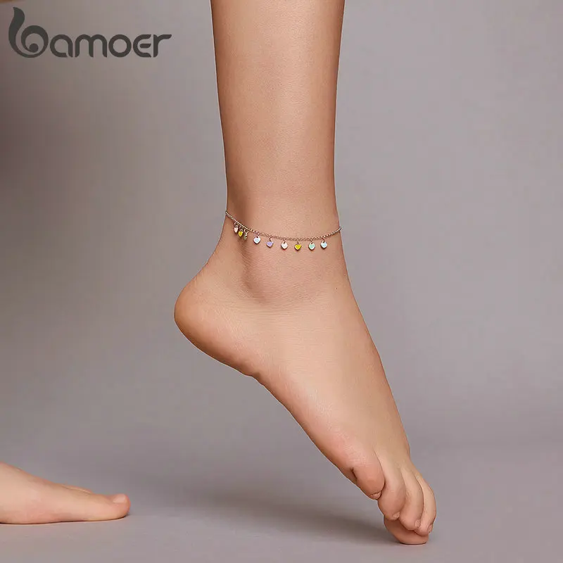 bamoer 925 Sterling Silver Enamel Heart Pendant Chain Anklet for Women Summer Foot Bracelet Feet Jewelry 2020 New SCT020