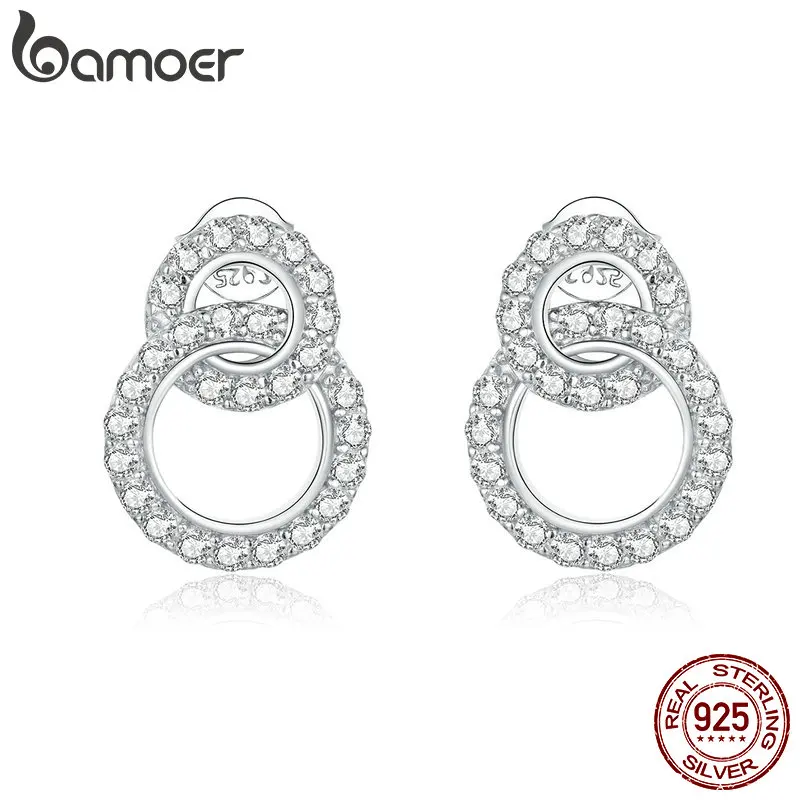 bamoer Double Circle Stud Earrings for Women 925 Sterling Silver Ear Pins Wedding Engagemetn Statement Jewelry Brincos BSE388