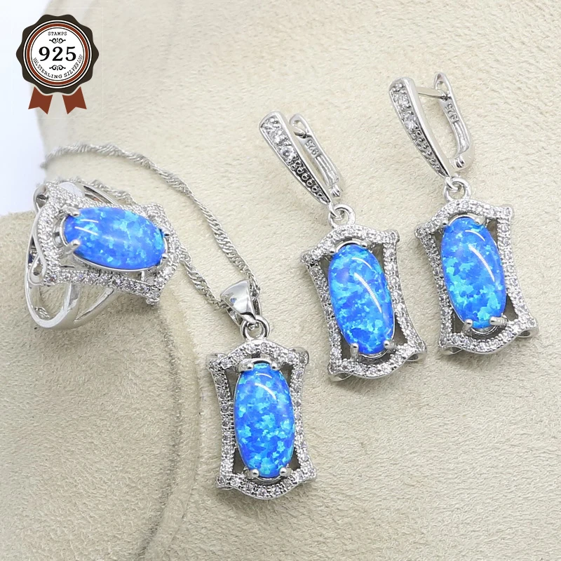 95%off Silver 925 Blue Opal Bridal Jewelry Sets For Women Necklace Earrings Pendants Ring Sets For Birthdays Gift