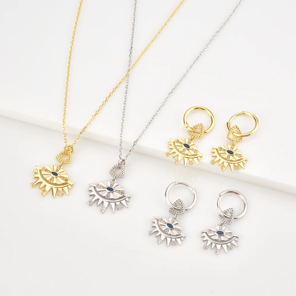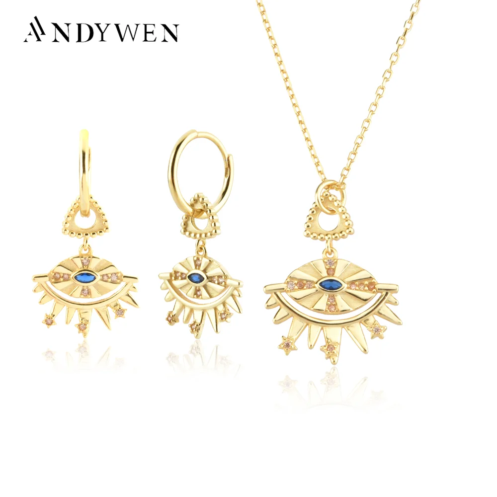 ANDYWEN 925 Sterling Silver Gold Eye Zircon CZ Drop Pendant Drop Earring Long Chain Pendant Necklace 2021 Women Jewelry Set