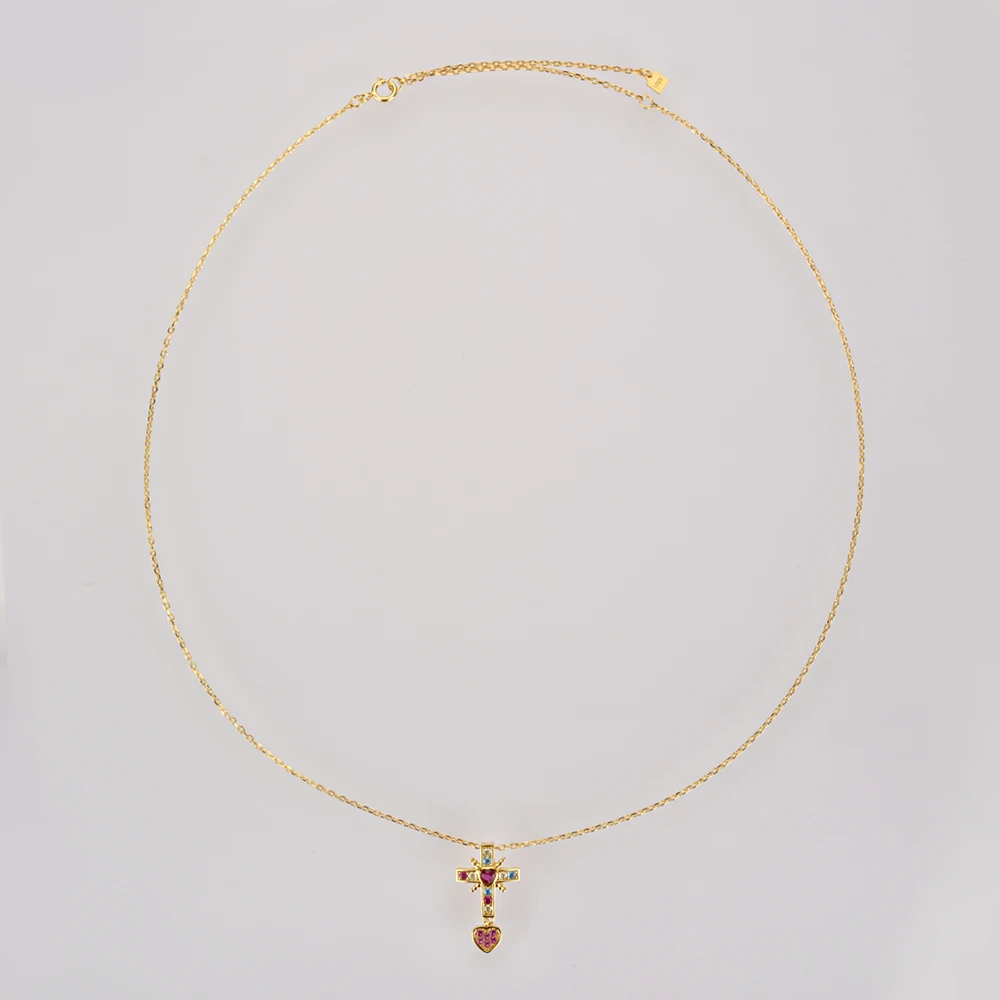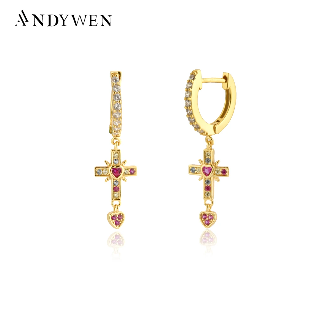 ANDYWEN 925 Sterling Silver Gold Rose Cross Pendiente Drop Earring Zircon Colorful Cross Pendant Long Chain Necklace Jewelry Set