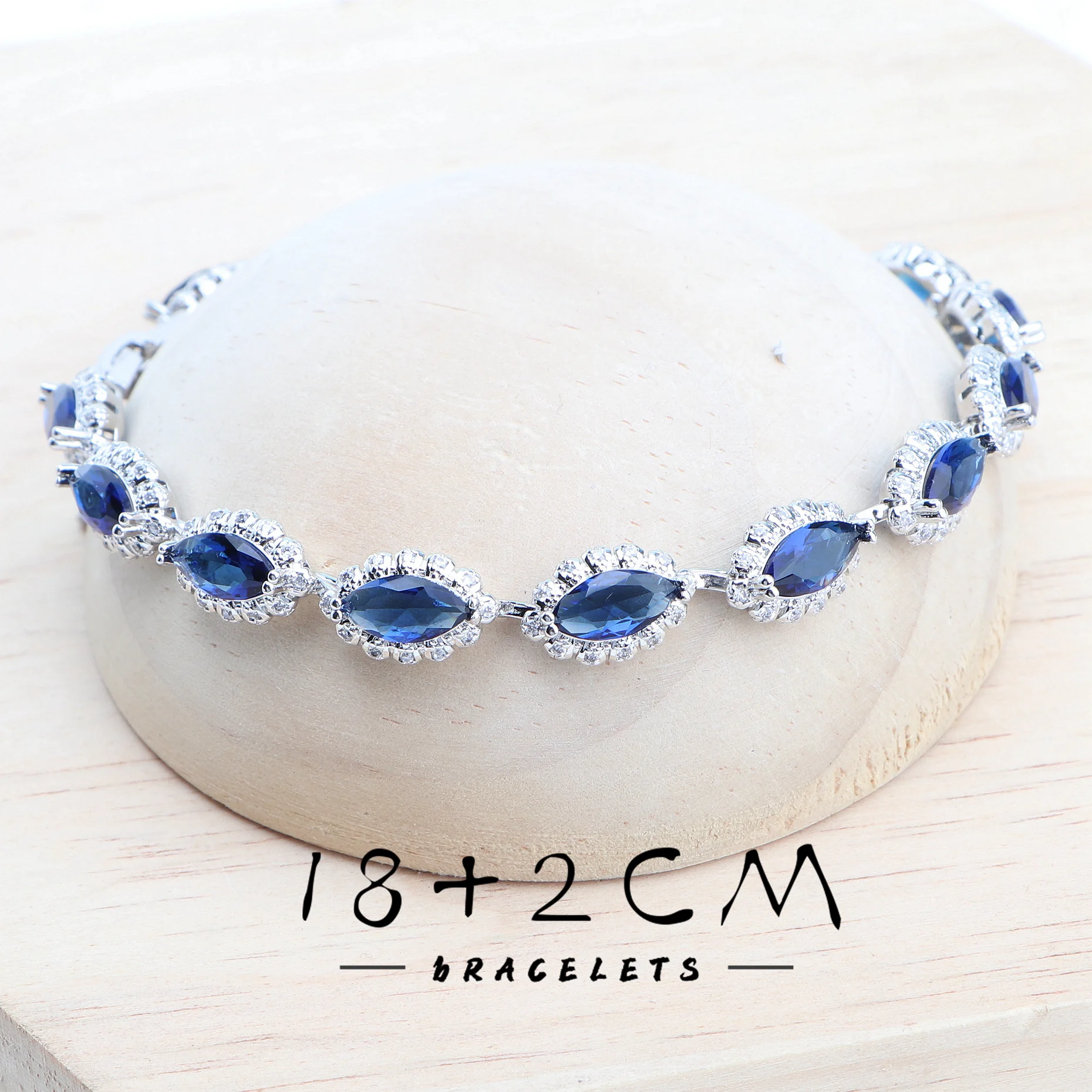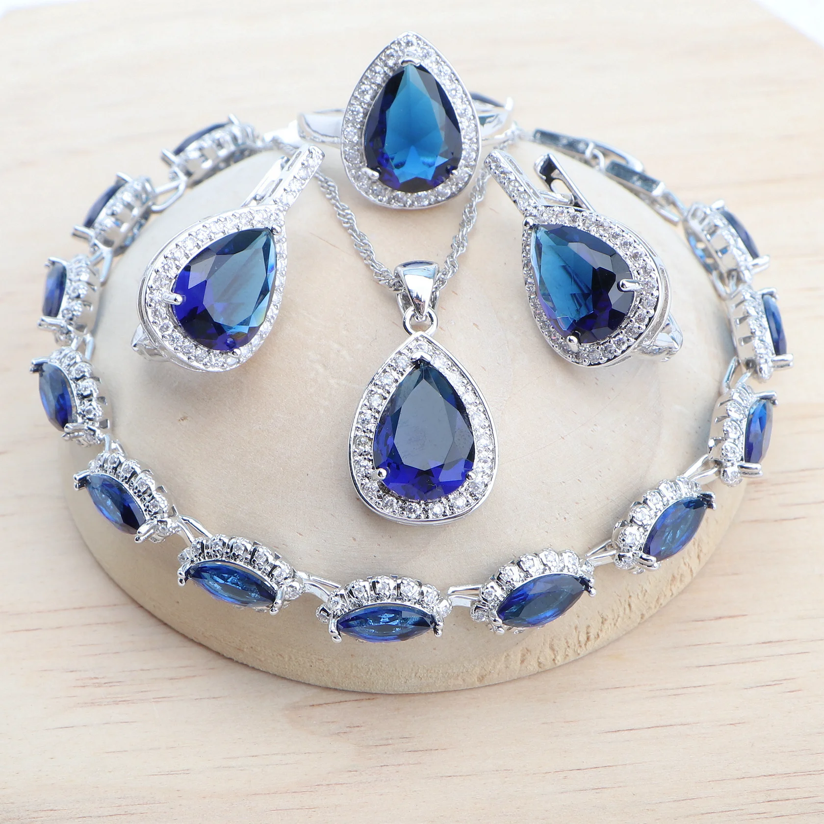 925 Sterling Silver Jewelry Sets Bridal Bracelets Blue Zircon Drop Earrings Rings Pendant Necklace Set Jewelry Wedding For Women