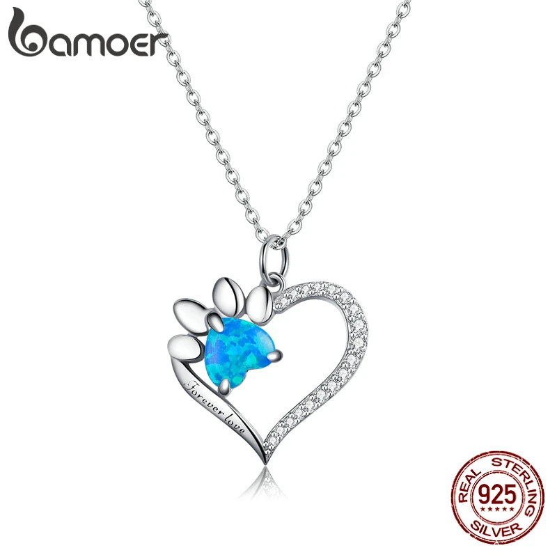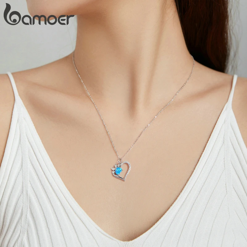 bamoer 925 Sterling Silver Heart Trace Blue Zircon Paw Dazzling Pendant Necklace Chain for Women Fashion Jewelry Gift BSN225