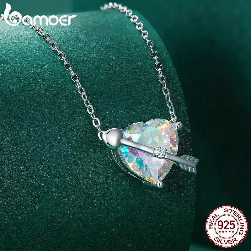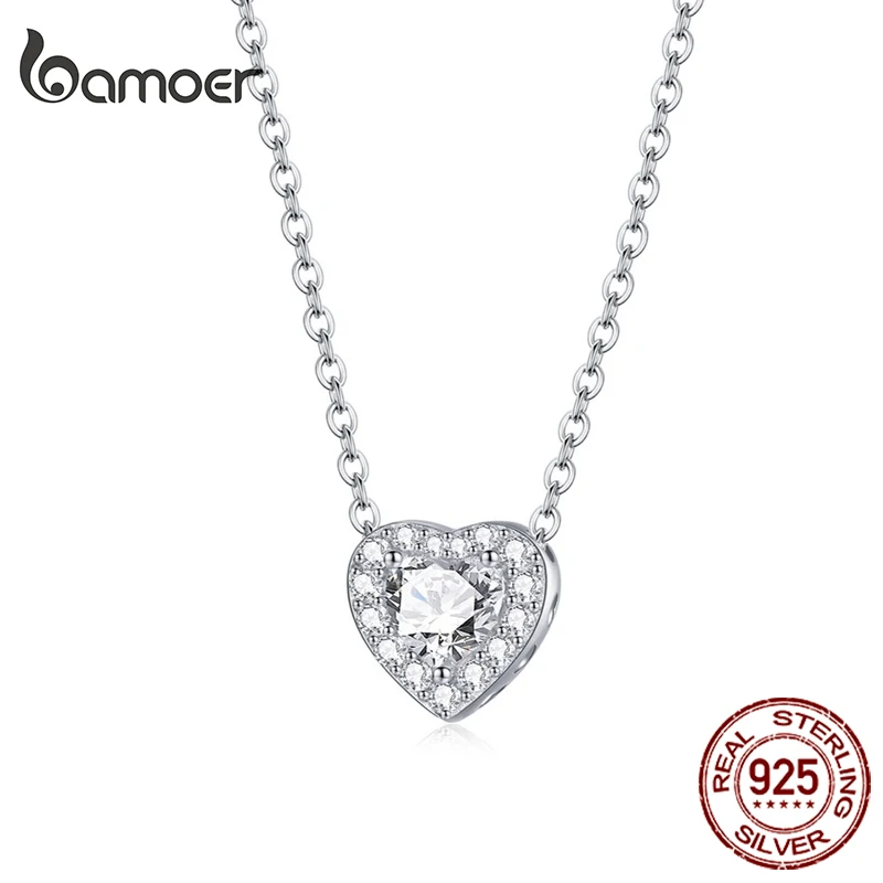 bamoer 925 Sterling Silver Bright Love Necklace Chain Dazzling Shiny Heart Shape Crystal Charm Wedding Engagement Jewelry