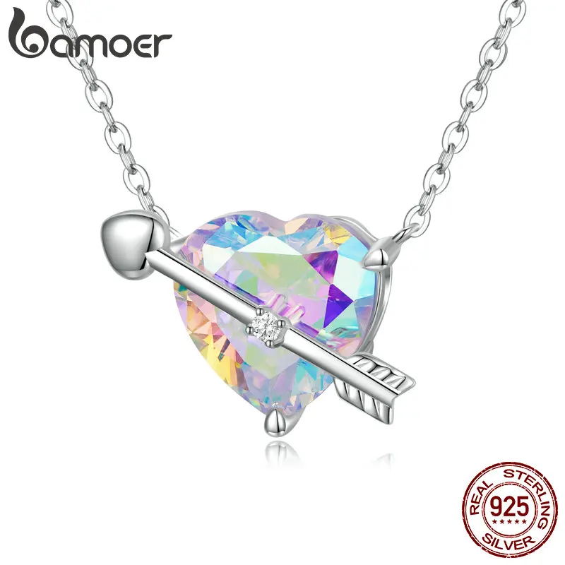 Bamoer Genuine 925 Sterling Silver Cupid Arrow Pendant Necklace for Women Fine Jewelry Adjustable Bling Heart Link Chain BSN255