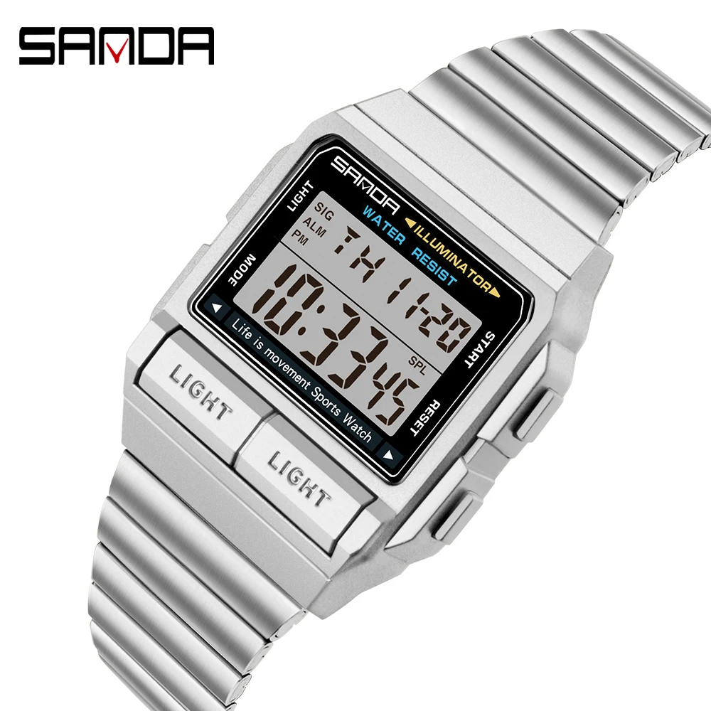 Fashion Sanda Brand Men Watches Retro Stainless Steel Band Digital Display erkek kol saati zegarek damski relogios Wristwatches