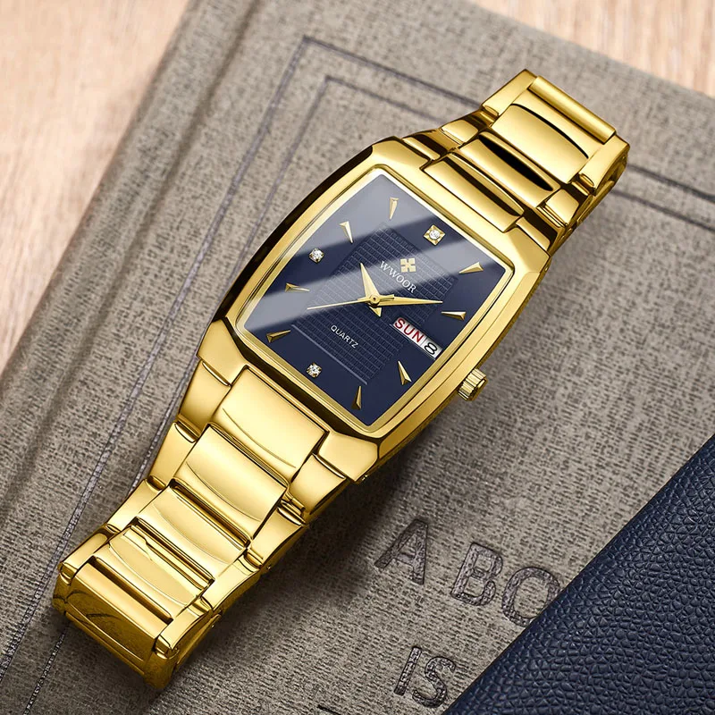 2022 WWOOR Luxury Business Men Watches Gold Quartz Stainless Steel Sport Square Clock Waterproof Week and Date Relogio Masculino