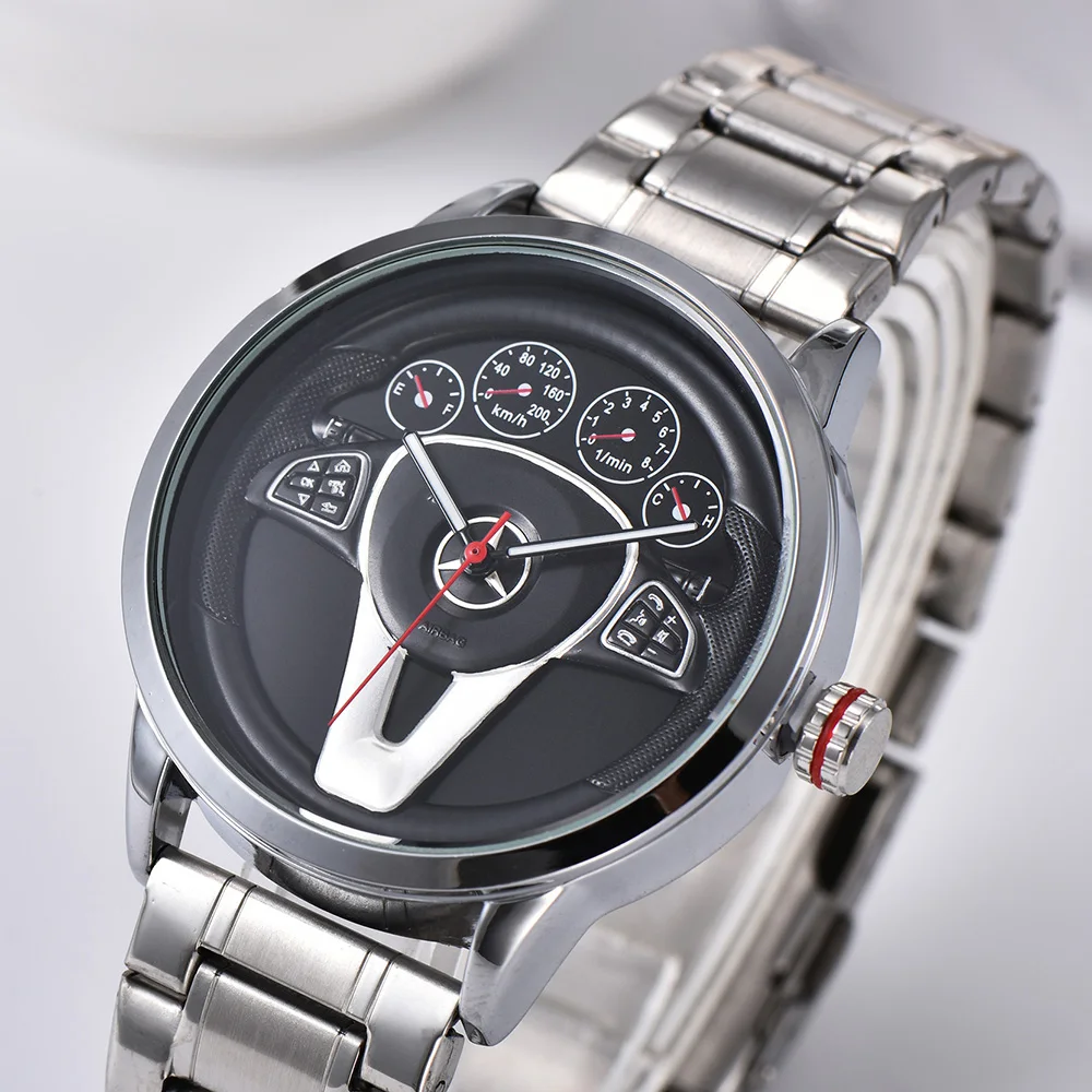 Casual Personality Classic precision Men's Quartz watch Racing Free Stainless Casual Sports 3D Car Steering Wheel Clock