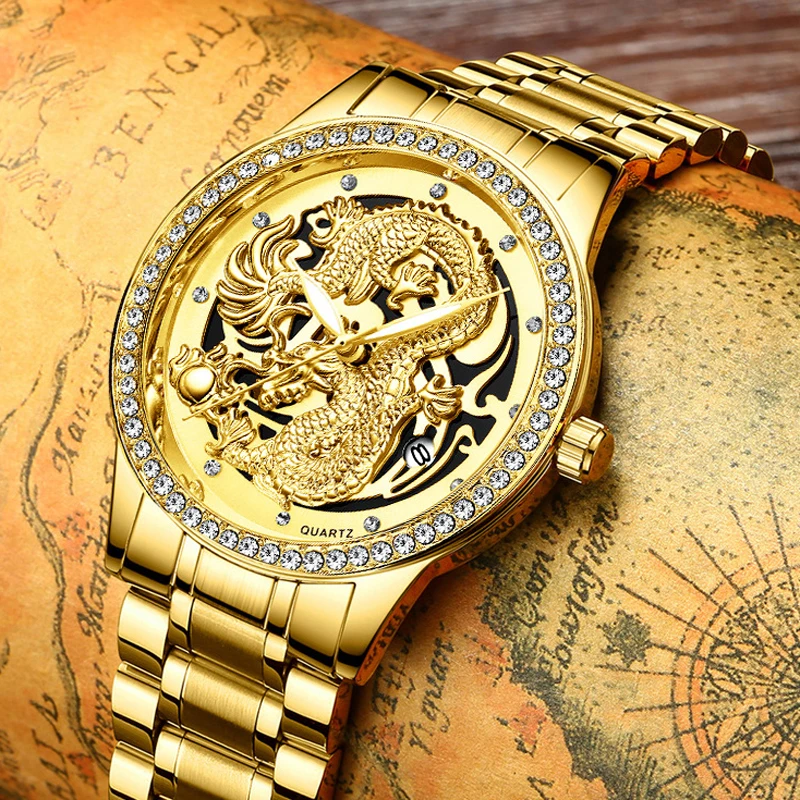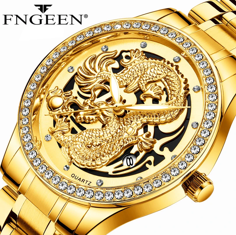 FNGEEN Mens Watches Top Brand Luxury Chinese Dragon Golden Quartz Watch Diamond Dial Stainless Steel Clock Male Relogio Masculin